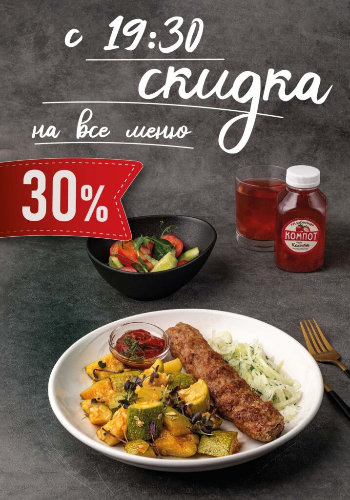 С 19:30 скидка 30% на ВСЕ меню